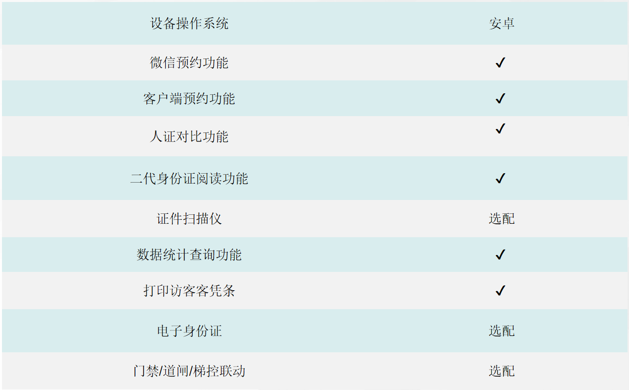 1.房卡收發 2.身份證識別 3.人臉識別 4.人證核驗 5.小票打印 6.二維碼掃描 7.POS 支付(外部擴展)
